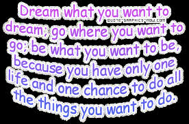 Dömmar , alla har vi drömmar om alla möjliga saker. Ofta drömmer man om pengar ,om att bli rik och ha ett stort hus, kanske t.o.m om att bli super stjärna ! De här drömmarn finns säkert hos alla men man kanske borde tänka större!Okej det är inget fel i att drömma stora drömmar men blir man lycklig av mycket pengar och stora hus ? Nej , det tror jag inte. Man borde kanske fundera mera på vad man vill med livet och vad man verkligen behöver ! Jag tror det som alla verkligen söker är kärlek och lycka ! En familj som älskar en , ett jobb man trivs men och många goda vänner är saker som säker skulle göra dagen ljusare. Men jag tycker också att man aldrig , jag menar ALDRIG ska ge upp sina drömmar. Lev livet för fult , kom ihåg dina drömmar men kom också ihåg andra viktiga saker!